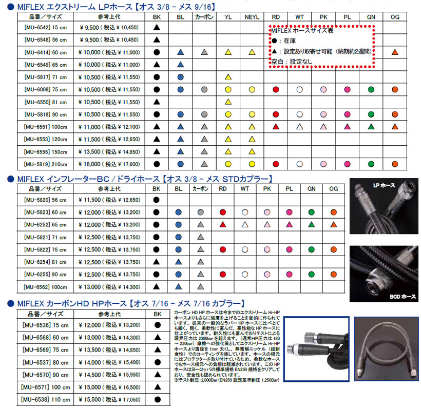 | ■ホースの種類とカラー [●通常在庫品 ▲取り寄せ可能商品(約2週間) 空白は設定がありません] |