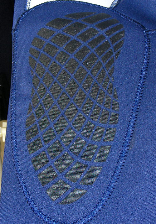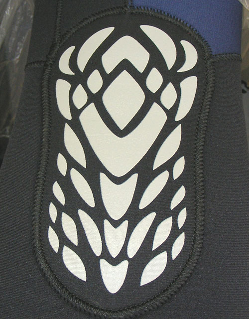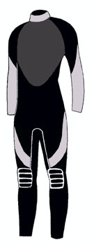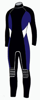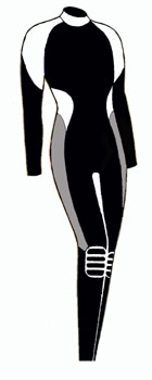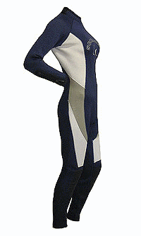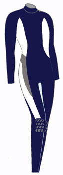 | 8、 | 体型を良く見せるデザイン | スーツのカット(カラーデザイン)により、着たときの見栄えは大きく変わります。例えば女性は「あまりお尻は大きく見せたくない」とか、「ウエストは少し締まって見せたい。」また、男性は「胸板は少し厚く見せたい」や男女問わず「足を長く見せたい」など、希望はあります。この要望にお応えできるようにスーツのデザインを考え色の配色を行ないました。 ウエットスーツの生地は縮みます。よってほんの少し大きめの既製サイズに設定し、1年後などに使用していく中で、水圧を受けたスーツは体の線にそって綺麗に馴染む事を理想にサイズの設定を行ないました。特に水温に鈍感な足の部分は脱着が楽になるように少し大きめで作られています。 |