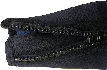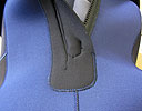 | 6、 | 楽な脱着で快適に | ダイバーへのアンケートで一番気になることに入ったのが「着たり脱いだりするのに時間と体力を使う」でした。この為、このスーツは全て手首と足首にファスナーを取り付けました。同時にサイズも一番引っかかりやすいのが、手の肘下(ひじした)と足の太腿中間(ふともも)でこの部分をほんの少しサイズを大きく設定した為に非常に着やすくなりました。 このファスナーも国内では1サイズ小さいタイプを使用していますが、一般的に保管期間の長いダイバーは次回の使用時に潮でファスナーが固まってしまうことも有ります。この現象を無くす為に1タイプ大きいものを使うことで潮の不着や潮が固まり動かなくならないようにセットしました。 ![]() |