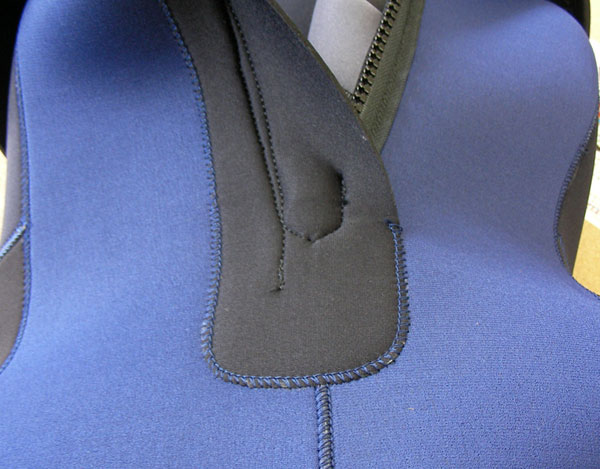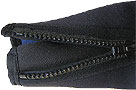 | 4、 | 裂け防止とファスナーパット | バックファスナーのスーツではひもを引っ張って閉める為、ファスナーの付根に負担が掛かり、腰の部分が破れることが有り、この部分を強化し破れにくくしています。![]() |