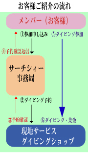 | 現在までに5年間ネット内でのサイトを運営し、全国からのご利用いただいています。こうしたダイバーの中にはどのショップに申し込めば良いのか、何処が良いのか全く判らない方もいます。こうしたダイバーを現地サービスまたは、ダイビングショップの皆様へご紹介し、メンバーの皆さんへ安心してダイビングを楽しんで頂くためのシステムです。 |